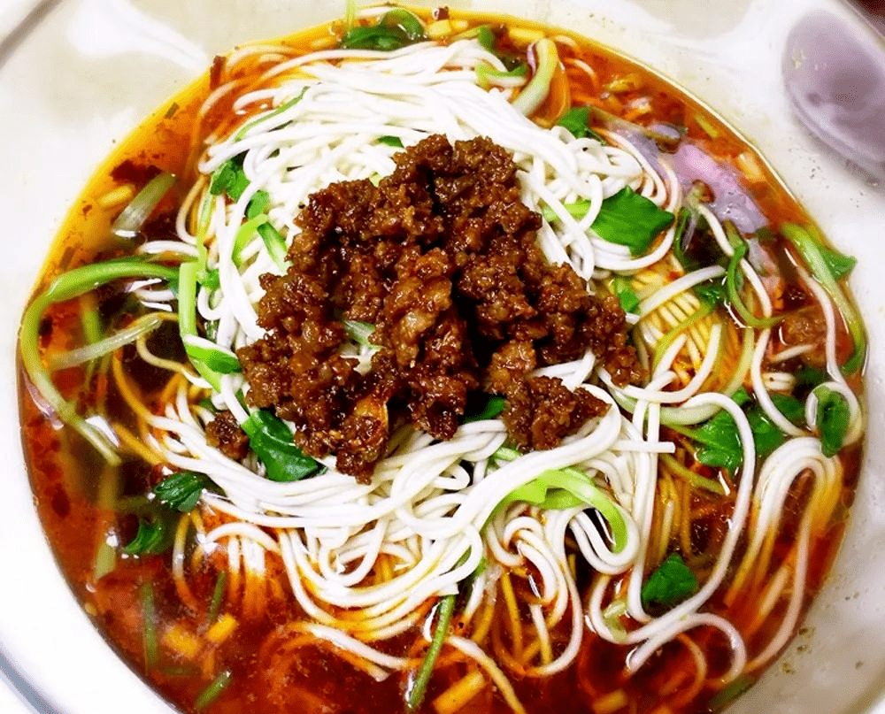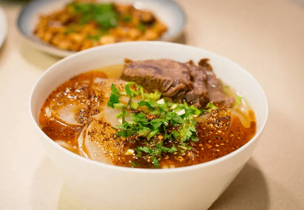 面煮好之后,过一次凉水。加入熬好的牛肉汤,撒上香菜蒜苗,浇上油泼辣子。真是满腹。